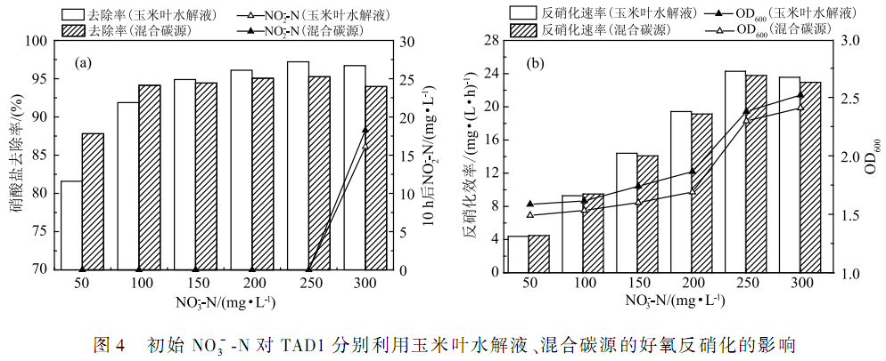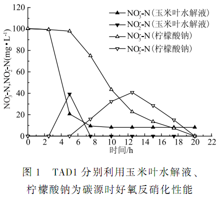 1. 4 菌株 TAD1 分別利用玉米葉水解液、檸檬酸鈉為碳源時(shí)好氧反硝化性能