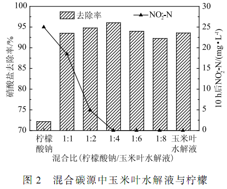 玉米葉水解液與傳統(tǒng)碳源混合可能會(huì)提高硝酸鹽去除率,使處理后水質(zhì)達(dá)到更高標(biāo)準(zhǔn)。 將玉米葉水解液與檸檬酸鈉溶液以不同的比例混合,檸檬酸鈉加入量基于 C / N 為 9,初始 NO -3 -N 為 100 mg·L - 1時(shí),考察混合比對(duì)好氧反硝化性能的影響。