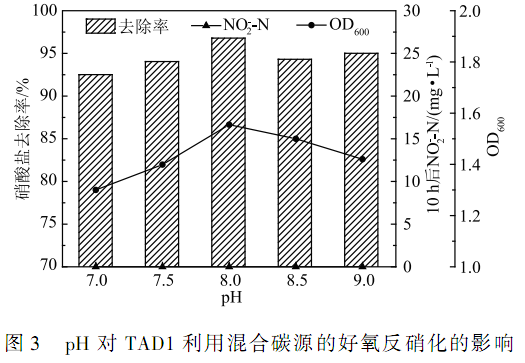 用,從而充分還原硝酸鹽。 另外,檸檬酸鈉能使周質(zhì)硝酸鹽還原酶活性增強(qiáng),使好氧反硝化進(jìn)行得更徹底。 以混合液為碳源時(shí),最適宜 pH 為 8. 0。 這時(shí)由于 TAD1 利用含玉米葉水解液的混合碳源生長(zhǎng)時(shí),在胞外酶的作用下進(jìn)一步將糖類分解為有機(jī)酸,使 pH 降低,偏堿性有利于補(bǔ)償碳源分解帶來(lái)的 pH 下降。但是,在 pH 為 7. 0 ~ 9. 0 時(shí),去除率均高于 92. 5% ,說(shuō)明 TAD1 能適應(yīng)廢水處理過(guò)程中的 pH 的波動(dòng),具有實(shí)際意義。