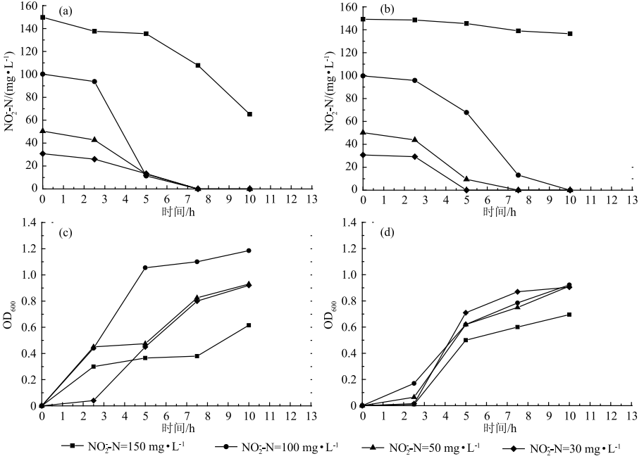 實(shí)驗(yàn)考察不同 NO -2 -N 對(duì) TAD1 利用2 種碳源的好氧反硝化性能的影響,結(jié)果如圖5 所示。 由圖5( a)與 5( b)可看出,當(dāng)以玉米葉水解液為唯一碳源時(shí),初始 NO -2 -N 為 30 ~ 100 mg·L - 1時(shí),亞硝酸鹽均在 7. 5h 內(nèi)去除。 而利用混合液作為碳源時(shí),30 mg·L - 1NO -2 -N 在5 h 內(nèi)去除,50 mg·L - 1NO -2 -N 在7. 5 h 內(nèi)去除,100 mg·L - 1NO -2 -N 在 10 h 內(nèi)去除。 當(dāng)初始 NO -2 -N 為 150 mg·L - 1時(shí),利用玉米葉水解液生長(zhǎng)的TAD1 在 10 h 內(nèi)去除了 56. 46% 的 NO -2 -N。 而利用混合液生長(zhǎng)的 TAD1 在 10 h 內(nèi)僅僅去除了 8. 54% 的NO -2 -N。 說(shuō)明碳源不足導(dǎo)致好氧反硝化進(jìn)行不徹底,亞硝酸鹽去除率低;玉米葉水解液更適于高濃度亞硝酸鹽的去除。 由圖 5( c)可以看出,玉米葉水解液作為碳源時(shí),當(dāng) NO -2 -N 高于 30 mg·L - 1,TAD1 從 0 h開始就迅速生長(zhǎng)。 當(dāng) NO -2 -N 為 100 mg·L - 1培養(yǎng) 10 h 后,OD600達(dá)到最大值 1. 185,而當(dāng) NO -2 -N 為 150mg·L - 1時(shí),培養(yǎng) 10 h 的 TAD1 的 OD600在 4 個(gè)濃度中最低,0. 615。 這說(shuō)明了以玉米葉水解液為碳源時(shí),NO -2 -N 為 30 ~ 100 mg·L - 1時(shí),亞硝酸鹽濃度增加并沒(méi)有抑制 TAD1 的生長(zhǎng),反而有助于其生長(zhǎng)。 由圖 5(d)可以看出,以混合液作為碳源時(shí),TAD1 從2. 5 h 開始迅速生長(zhǎng)。 在初始 NO -2 -N 為100 mg·L - 1培養(yǎng)10 h后,OD600達(dá)到最大值 0. 922,明顯低于同條件下玉米葉水解液為碳源的 OD600 。 因此,當(dāng) NO -2 -N < 50 mg·L - 1時(shí),混合碳源更有利于 TAD1 進(jìn)行好氧反硝化。 當(dāng) NO -2 -N > 50 mg·L - 1時(shí),玉米葉水解液碳源更具有優(yōu)勢(shì)。