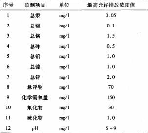 (2) 在脫硫廢水處理系統(tǒng)出口要監(jiān)測(cè)的項(xiàng)目和最高允許排放濃度值見下圖。