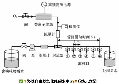 圖 1為羥基自由基氧化降解水中嗅味物質(zhì)GSM的實(shí)驗(yàn)系統(tǒng)示意圖, 該系統(tǒng)主要采用大氣壓強(qiáng)電場(chǎng)電離放電結(jié)合水力射流空化方式制備·OH, 并對(duì)水中一定濃度的GSM進(jìn)行氧化降解.簡(jiǎn)單地說(shuō), 綠色自然物質(zhì)O2經(jīng)減壓閥調(diào)節(jié)流量后輸入等離子體源中, 與窄間隙、強(qiáng)電場(chǎng)中的高能、高密度電子發(fā)生非彈性碰撞, O2受電子激勵(lì)后發(fā)生電離、分解、重組形成O2+、O(1D)、O、O2(a1Δg)、O2-、O3等高濃度氧活性粒子.這些氣相中的氧活性粒子由檢測(cè)器在線(xiàn)實(shí)時(shí)顯示濃度后, 經(jīng)流量計(jì)注入到射流器中, 在水力射流空化作用下, 氧活性粒子與水分子發(fā)生等離子體化學(xué)反應(yīng)生成·OH、HO2-、O2·-、O3·-、HO3·、H2O2等氧活性粒子溶液, 水中氧活性粒子的總濃度表示為總氧化劑(Total reactive oxidants, TRO) , 其濃度值由氣體放電總功率和氧氣流量調(diào)節(jié)控制.水泵將含有不同濃度的嗅味物質(zhì)GSM水樣經(jīng)流量計(jì)輸入射流器, 與生成的氧活性粒子溶液進(jìn)行混勻, 同時(shí)發(fā)生氧化降解反應(yīng).管路中接觸反應(yīng)時(shí)間為6 s, 圖中1~6取樣口的反應(yīng)時(shí)間間隔為1 s.