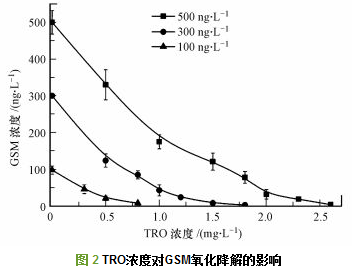1) 對(duì)100~500 ng·L-1范圍的GSM, TRO投加劑量在0.8~2.6 mg·L-1范圍內(nèi), 經(jīng)過(guò)處理后均可氧化降解到10 ng·L-1以下, 低于人類(lèi)嗅閾值, 滿(mǎn)足我國(guó)《生活飲用水衛(wèi)生標(biāo)準(zhǔn)》 (GB5749—2006).