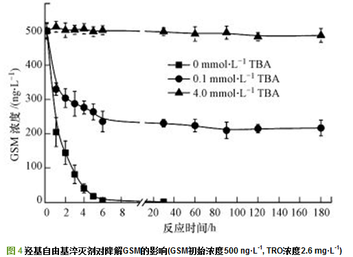 TBA是一種有效的·OH淬滅劑, 它與·OH反應(yīng)速率常數(shù)為4.0×108 L·mol-1·s-1, .本實(shí)驗(yàn)通過(guò)在GSM水樣中加入0.1 mmol·L-1和4.0 mmol·L-1 TBA, 淬滅反應(yīng)過(guò)程產(chǎn)生的·OH, 驗(yàn)證降解GSM的主要物質(zhì)為·OH.實(shí)驗(yàn)結(jié)果如圖 4所示, 加入TBA淬滅·OH后, 對(duì)GSM的氧化降解效果明顯降低.當(dāng)TRO投加劑量為2.6 mg·L-1, 不加TBA時(shí), 管路中接觸反應(yīng)6 s, 可將初始濃度500 ng·L-1 GSM降解到26 ng·L-1, 反應(yīng)180 s降解至2.0 ng·L-1, 對(duì)GSM氧化降解率為99%;當(dāng)水樣中加入的TBA濃度為0.1 mmol·L-1時(shí), 管路反應(yīng)6 s, GSM降解到236 ng·L-1, 氧化降解率降低至52.8%, 延長(zhǎng)反應(yīng)時(shí)間到180 s, GSM氧化降解率為56.5%;當(dāng)TBA濃度為4.0 mmol·L-1時(shí), 反應(yīng)180 s對(duì)GSM氧化降解率降低至14.6%.