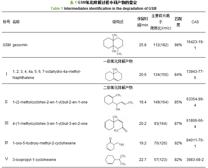 由表 1可知, 氧化降解GSM過(guò)程中檢測(cè)捕捉到8種中間產(chǎn)物, 包括1個(gè)雙環(huán)化合物、4個(gè)單環(huán)化合物和3個(gè)開(kāi)環(huán)單鏈化合物, 初步分析·OH氧化降解GSM的過(guò)程為:首先, ·OH對(duì)GSM側(cè)鏈—OH及其相鄰的—CH3進(jìn)行氧化脫氫脫甲基轉(zhuǎn)移自由電子到GSM分子上, 破壞GSM穩(wěn)定的化學(xué)結(jié)構(gòu), 生成帶環(huán)內(nèi)雙鍵的一級(jí)氧化降解產(chǎn)物Ⅰ; 其次, ·OH與Ⅰ發(fā)生加成反應(yīng), 斷裂環(huán)內(nèi)C—C單鍵, 破壞雙環(huán)結(jié)構(gòu), 生加成反應(yīng), 斷裂環(huán)內(nèi)C—C單鍵, 破壞雙環(huán)結(jié)構(gòu), 生成檢測(cè)到的單環(huán)二級(jí)氧化降解產(chǎn)物, 如Ⅱ、Ⅲ、Ⅳ、Ⅴ; 再次, ·OH與單環(huán)產(chǎn)物繼續(xù)加成斷鍵, 破壞環(huán)狀結(jié)構(gòu), 生成三級(jí)小分子醛酮類(lèi)氧化降解產(chǎn)物, 如Ⅵ、Ⅶ、Ⅷ; 最后, 小分子醛酮類(lèi)氧化降解產(chǎn)物被·OH最終礦化生成CO2和H2O.這與Fotiou等研究TiO2光催化氧化降解GSM的中間過(guò)程類(lèi)似.