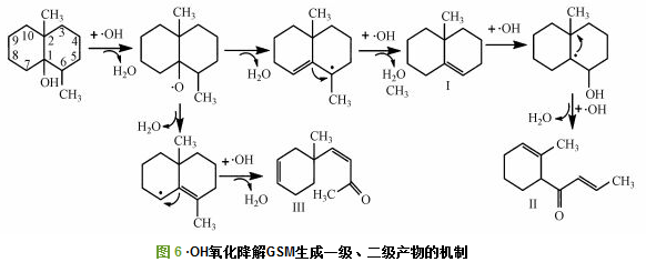 ·OH氧化降解GSM生成一級(jí)、二級(jí)產(chǎn)物的機(jī)制如圖 6所示, GSM分子中C(1)上—OH是唯一的極性親水基團(tuán), ·OH有一個(gè)未配對(duì)自由電子, 極易與其發(fā)生親電反應(yīng), 脫除一個(gè)H2O分子, 同時(shí)將自由電子轉(zhuǎn)移到GSM雙環(huán)內(nèi), 破壞雙環(huán)結(jié)構(gòu)穩(wěn)定性. ·OH繼續(xù)進(jìn)攻C(6)上—CH3, 脫去H2O分子和—CH3生成一級(jí)氧化降解產(chǎn)物Ⅰ(1, 2, 3, 4, 4a, 5, 6, 7-octahydro-4a-methyl-Naphthalene), Ⅰ與·OH繼續(xù)發(fā)生加成反應(yīng), 獲得自由電子, 斷裂環(huán)內(nèi)C—C單鍵, 生成二級(jí)單環(huán)產(chǎn)物Ⅱ(1-(2-methylcyclohex-2-en-1-yl)but-2-en-1-one).此外, 已脫去H2O分子的GSM也可能直接斷開(kāi)環(huán)內(nèi)C=C生成二級(jí)產(chǎn)物Ⅲ (4-(1-methylcyclohex-3-en-1-yl)but-3-en-2-one).綜上, GSM穩(wěn)定的雙環(huán)結(jié)構(gòu)被·OH破壞, 斷鍵生成了單環(huán)中間產(chǎn)物.