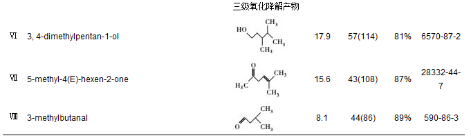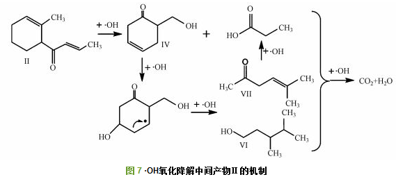 ·OH氧化降解二級(jí)中間產(chǎn)物的機(jī)制如圖 7所示, 以二級(jí)產(chǎn)物Ⅱ?yàn)槔? 其側(cè)鏈比六元環(huán)更易與·OH發(fā)生加成反應(yīng), 被·OH斷鍵生成Ⅳ (1-oxo-5-hydroxy-methyl-2-cyclohexene)和小分子丙酸, 之后·OH攻擊Ⅳ環(huán)上C=C雙鍵, 斷裂己烯環(huán)生成三級(jí)小分子醛酮酸類(lèi)產(chǎn)物Ⅵ (3, 4-dimethylpentan-1-ol)、Ⅶ (5-methyl-4(E)-hexen-2-one)以及丙酸, 這些醛、酮、酸類(lèi)小分子有機(jī)物繼續(xù)被·OH氧化降解, 最終礦化生成H2O和CO2.