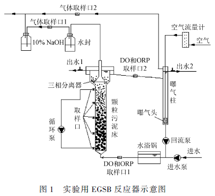 進(jìn)水和回流水分別采用蠕動(dòng)泵加壓,兩者合流進(jìn)入EGSB 反應(yīng)器?;亓魉占狡貧庵鶅?nèi),通過給曝氣柱內(nèi)回流水曝氣的方式來給顆粒污泥床供氧,并通過控制曝氣柱內(nèi)曝氣量來控制EGSB 反應(yīng)器內(nèi)溶解氧量。對進(jìn)出水氧化還原電位(ORP)進(jìn)行監(jiān)測以調(diào)節(jié)曝氣量,進(jìn)而控制EGSB 反應(yīng)器內(nèi)的氧化還原狀態(tài)。