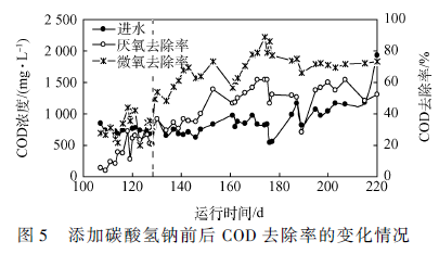 查閱大量文獻(xiàn)資料,分析表明此時(shí)的微氧顆粒污泥菌群中降解這些毒性污染物質(zhì)的菌群不存在或者說他們的活性不夠強(qiáng),可能是他們有特殊的營養(yǎng)需求,其中無機(jī)碳營養(yǎng)是需要重點(diǎn)考慮的(各種污染物質(zhì)降解菌之間會(huì)競爭無機(jī)碳源)。接下來給反應(yīng)器中添加無機(jī)碳營養(yǎng)物———碳酸氫鈉(說明:不是為了調(diào)節(jié)pH,事實(shí)上添加碳酸氫鈉后反應(yīng)器內(nèi)pH也沒有出現(xiàn)明顯變化),分析COD 去除率的變化情況,具體見圖5。