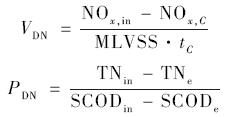 式中:tC 為SS 被消耗完的時(shí)間點(diǎn);NOx,in 為反應(yīng)初始階段的NOx 濃度;NOx,C 為tC 時(shí)刻的NOx 濃度;TNin 和TNe 分別為反應(yīng)初始階段和反應(yīng)結(jié)束的TN 濃度;SCODin 和SCODe 分別為反應(yīng)初始階段和反應(yīng)結(jié)束的SCOD 濃度。