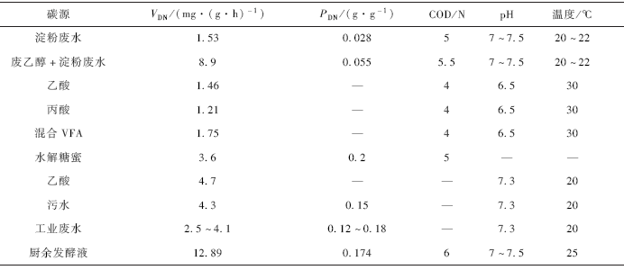 根據(jù)圖5 和以上公式可以計(jì)算出發(fā)酵液的反硝化性能參數(shù)VDN,Ss = 12. 89 mg·(g·h) - 1 和PDN =0. 174 g·g - 1 (COD)。VDN 代表的是反硝化過(guò)程中N的減少速率,PDN 代表的是活性污泥因消耗一定量的COD 而減少的N 的量。理論上,每轉(zhuǎn)化1 g NO3 -N成N2 需要2. 86 g COD ( PDN,理論值= 0. 35 g · g - 1(COD));但實(shí)際上系統(tǒng)中的碳源不僅需要用于反硝化過(guò)程的電子,還要為系統(tǒng)中的微生物的新陳代謝提供能源和能量,因此真正的PDN 值都應(yīng)該小于理論值。表2 比較了一些化學(xué)有機(jī)物和工業(yè)廢水的反硝化性能參數(shù),可以看出發(fā)酵液的VDN 和PDN 明顯優(yōu)于很多化學(xué)有機(jī)物和工業(yè)廢水,由此可見(jiàn)短程發(fā)酵液具有高效的反硝化性能。