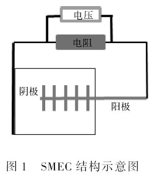 SMEC 反應(yīng)器 如圖1 所示。陽極采用碳刷,陰極采用含0. 5 mg·cm - 2 的Pt/ C 催化體系的碳布,電極間距約1 cm。在100 mmol·L - 1 PBS、乙酸鈉1 280 mg·L - 1 、初始pH 6. 0、溫度(35 ± 1)℃ 和外加電阻10 Ω 的條件下啟動培養(yǎng),SMEC 通過成熟SMFC改裝而得,反應(yīng)器菌種來自成熟UASB 污泥顆粒,含鎳模擬廢水通過NiCl2 進行溶解配制。