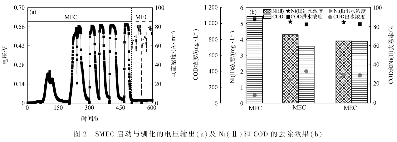 如圖2(a)所示,SMFC 運行300 h 后,SMFC 運行300 h,電壓可持續(xù)穩(wěn)定達到(0. 570 ± 0. 005)V(外加電阻1 000 Ω),經(jīng)轉(zhuǎn)變?yōu)镾MEC 后,在0. 3 V 外加電壓下,負載10 Ω 的電壓輸出在(0. 020 ± 0. 003)V,電流密度達到(70. 3 ± 10. 2)A·m - 3 ,與QIN 等[7] 結(jié)果相似。SMEC 運行48 h 時,5 mg·L - 1 Ni(Ⅱ)和1 000mg·L - 1 COD 的去除率分別可達到(62. 1 ± 3. 7)% 和(68. 2 ± 4. 7)% ,較雙室MEC 去除率[7] 相當,但去除速率高于雙室(圖2(b))。