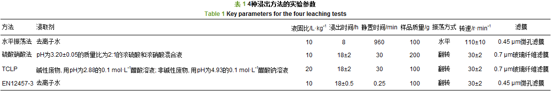 本文采用的4種浸出方法分別是HJ557-2009-固體廢物-浸出毒性浸出方法-水平振蕩法, HJT299-2007-固體廢物-浸出毒性浸出方法-硫酸硝酸法, 美國(guó)環(huán)保署(SUEPA)方法(TCLP)和歐盟的EN12457-3. 4種浸出方法的具體操作條件見(jiàn)表 1.