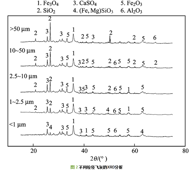 對(duì)于不同粒徑飛灰顆粒使用X射線(xiàn)熒光光譜分析儀(ZSX100e)分析主要成分見(jiàn)表 2.使用X射線(xiàn)衍射(PRO/MPD)分析不同粒徑的礦物相, 見(jiàn)圖 2.飛灰的主要成分包括Fe2O3、Al2O3、CaO、SiO2、SO3、P2O5、MgO和K2O.其中SiO2的含量是隨著粒徑的增大而增大的, 而Fe2O3、Al2O3、CaO、MgO的含量則隨粒徑的增大呈現(xiàn)出減小的趨勢(shì).