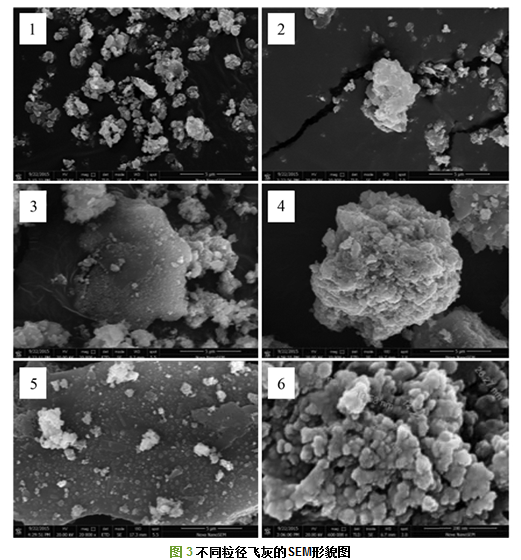馮軍會(huì)等[14]研究了不同粒徑飛灰中重金屬總量的分布, 發(fā)現(xiàn)大粒徑上重金屬的總量分布與飛灰在細(xì)小粒徑上的分布有高于中等粒徑飛灰的相似規(guī)律, 推測(cè)大粒徑飛灰是由于細(xì)顆粒飛灰聚集或者較大顆粒表面吸附了較小顆粒的飛灰而成. 圖 3為不同粒徑飛灰的電鏡形貌, 5個(gè)粒度段粒徑從小到大依次編號(hào)為1、2、3、4、5, 放大倍數(shù)為2萬(wàn)倍. 6號(hào)圖片為放大倍數(shù)為60萬(wàn)倍的粒徑<1 μm的電鏡形貌.從中可以看出小粒度段中的顆粒物是由更小的顆粒物團(tuán)聚而成, 而大粒度段顆粒具有粗糙的表面, 容易吸附較小的飛灰顆粒.