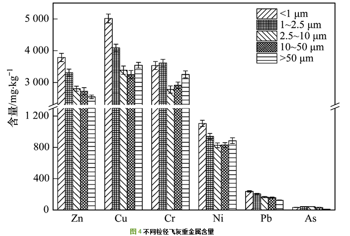由圖 4可以看出, 飛灰中重金屬Zn和Pb的含量隨著粒徑的增加而降低, 而Cu、Cr、Ni和As的含量則表現(xiàn)為隨粒徑的增加先下降后上升的趨勢(shì).這是因?yàn)榱叫〉娘w灰比表面積大, 更容易富集高濃度的重金屬.結(jié)合顆粒物形成機(jī)理分析:大粒徑飛灰主要是由于污泥焚燒過(guò)程中礦物質(zhì)破碎, 熔融形成; 小粒徑的顆粒物主要是由重金屬元素均相成核以及異相凝結(jié)形成, 在這個(gè)冷凝過(guò)程中, 重金屬附著在大顆粒的飛灰上.如圖 3中飛灰形貌, 大粒徑的飛灰容易吸附小粒徑的飛灰顆粒, 所以在>50 μm粒徑段出現(xiàn)重金屬含量升高的現(xiàn)象.