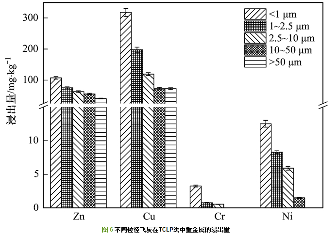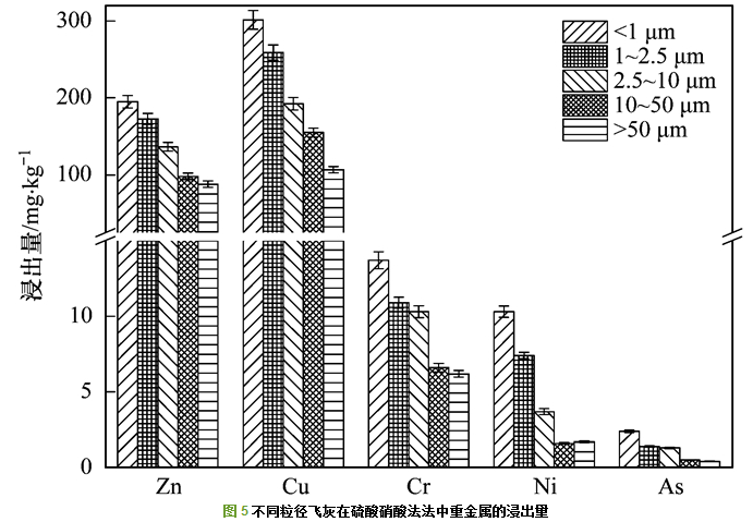 (1) 飛灰中重金屬Cu和Zn的含量及不同浸出方法中的浸出量都較高, 不同重金屬含量隨粒徑的增加而降低, 因?yàn)榱叫〉娘w灰比表面積大, 更容易富集高濃度的重金屬.重金屬Cu、Cr、Ni和As的含量在最大粒徑段(>50 μm)略有增加, 主要是因?yàn)榇罅斤w灰容易吸附小粒徑飛灰顆粒.