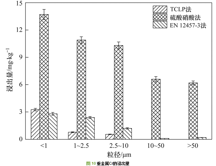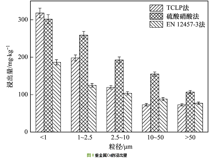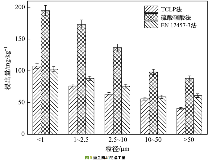 圖 5~7為不同粒徑飛灰在不同浸出方法中的重金屬浸出量.其中Pb的浸出量低于ICP-OES的最低檢測(cè)限, As的浸出量在TCLP法中的浸出量也低于最低檢測(cè)限, 所以在圖中未畫(huà)出.在不同的浸出方法中, 重金屬Zn和Cu的浸出含量都較高, 明顯高于其他重金屬, 其中, 在TCLP法浸出毒性中<1 μm粒徑段的浸出含量最高, 分別為107.34 mg·kg-1和318 mg·kg-1.在不同的浸出方法中, 隨著粒徑的增加, 重金屬的浸出量逐漸減少, 這與飛灰中重金屬總量隨粒徑的變化趨勢(shì)一致.