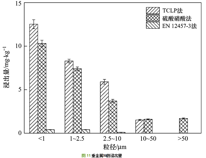 (2) 在利用HJ557-2009-水平振蕩法模擬地表水對(duì)不同粒徑飛灰的侵蝕時(shí), 重金屬的浸出量在安全范圍以?xún)?nèi).重金屬Cu、Zn和Ni在TCLP和硫酸硝酸法中的浸出量要明顯高于在歐盟EN12457-3中的浸出量。