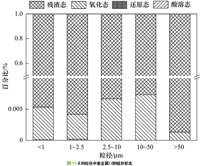 而重金屬Cr則表現(xiàn)為在翻轉(zhuǎn)振蕩法中的浸出量明顯高于其他兩種方法.分析原因?yàn)楦亟饘貱r的賦存形態(tài)有關(guān).對(duì)不同粒徑飛灰采用歐共體提出的連續(xù)四步提取法(BCR)分析如圖 12.可以看出, Cr的殘?jiān)鼞B(tài)含量達(dá)到了99%以上, 所以在酸溶態(tài)下的冰醋酸溶液中的含量為0.又因TCLP法的浸取液為醋酸溶液, 所以重金屬Cr在TCLP方法中的浸出含量比較低.