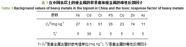 式中, k是重金屬的種類(lèi), Ck是重金屬的含量(mg·kg-1), CkO是重金屬濃度的背景值(mg·kg-1), O是重金屬的數(shù)量, 評(píng)估參考值采用工業(yè)化之前的表層土中重金屬最高的背景值.具體數(shù)值見(jiàn)表 3.
