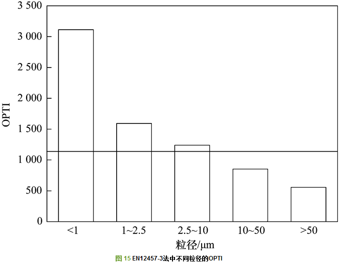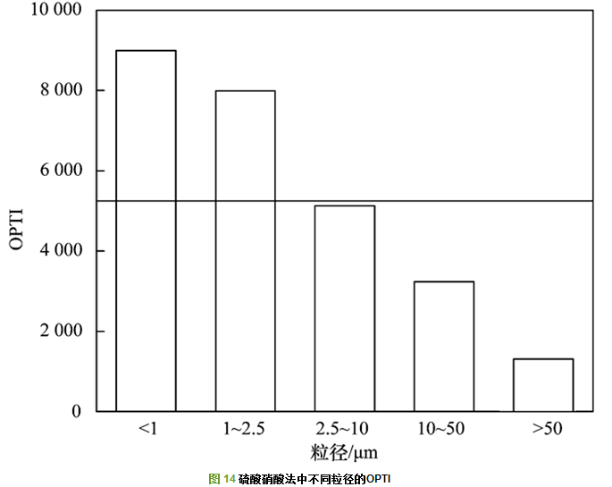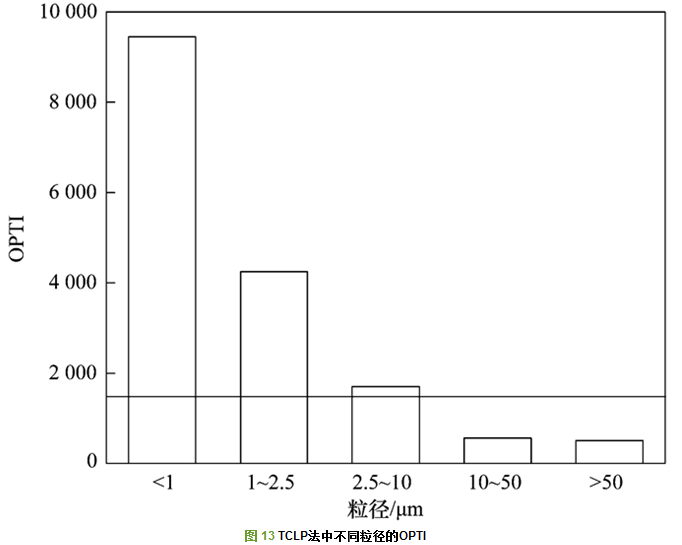 從圖 13~15中可以看出, 隨著粒徑的減小, 飛灰的毒性增強(qiáng), 并且在TCLP法和硫酸硝酸法中的毒性遠(yuǎn)大于歐盟EN12457-3中的毒性.其中的橫線(xiàn)部分代表了未經(jīng)分級(jí)的原樣飛灰的綜合毒性, 在TCLP法, 硫酸硝酸法, 歐盟EN12457-3法中的OPTI值分別是:1 512.24、5 162.37和1 159.22.從圖 13~15中可以看出, 粒徑段為10~50 μm和>50 μm的飛灰的OPTI值明顯在原樣飛灰的OPTI值之下.所以, 將飛灰的粒徑分成兩部分:大于10 μm和小于10 μm, 可以看出原樣飛灰的OPTI值介于兩者之間.所以可以得出結(jié)論, 小于10 μm的飛灰更具有毒性, 危害性更大.因此, 應(yīng)該根據(jù)不同飛灰的粒度來(lái)考慮飛灰的資源化利用.