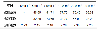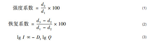 式中,d1、d2、d3分別為絮體在初始穩(wěn)定階段、破損階段和再生穩(wěn)定階段的平均粒徑,I為光強,Q為散射矢量,方程(3)中的斜率便為分形維數(shù).強度系數(shù)越大表明絮體更耐高剪切力,也就意味著絮體不易被剪切力打碎;恢復(fù)系數(shù)越大表明絮體經(jīng)過高剪切力作用后可恢復(fù)性較好;Df值高表明絮體結(jié)構(gòu)更加密集和緊湊,而較低的Df表明絮體結(jié)構(gòu)比較松散且高度支化.