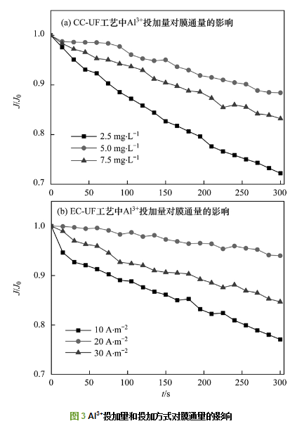 (2)在CC-UF和EC-UF工藝中,Al3+投加量控制在5 mg ·L-1時對膜污染的減緩效果最好,反應(yīng)結(jié)束時膜通量分別保持在原始膜的88.42%、93.99%.