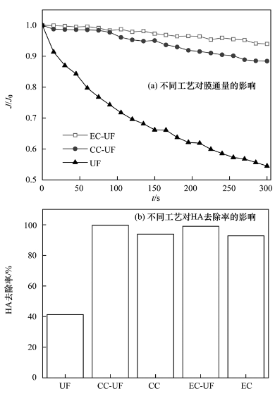 (1) CC、EC作為UF的預(yù)處理技術(shù),不僅有效減緩了膜污染,而且還提高了出水質(zhì)量.相對于單獨使用UF工藝時,在膜通量方面分別提高約33.92%、39.49%,HA去除率方面分別提高約58.38%、57.69%.