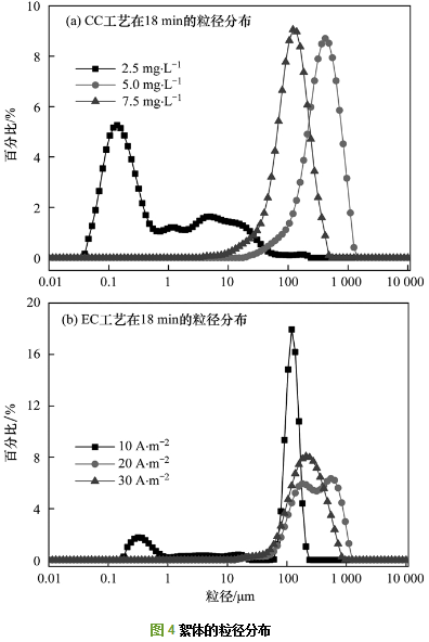 EC試驗:試驗采用自制有機玻璃槽(有效容積為400 mL,下端留有出水口)作為反應(yīng)器,陰、陽兩極均采用鋁板,極板尺寸為115 mm×65 mm×2 mm,極板間距20 mm.根據(jù)Faraday定律選取電流密度10、20、30 A ·m-2電解3 min,使得反應(yīng)器內(nèi)Al3+濃度分別達到2.5、5、7.5 mg ·L-1, 試驗先以200 r ·min-1快攪3 min,隨后以100 r ·min-1慢攪15 min使絮體穩(wěn)定增長.