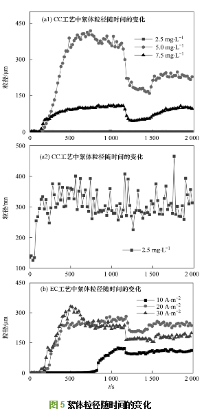 在CC-UF工藝中分別選取絮凝劑投加量2.5、5、7.5 mg ·L-1,EC-UF工藝中分別選取電流密度10、20、30 A ·m-2,考察Al3+投加量和投加方式對絮體性質(zhì)的影響,結(jié)果如圖 5與表 1.由圖 5(a)可知在CC-UF工藝中,絮凝劑的加入使得帶正電的鋁離子和鋁絡(luò)合物與帶負電的HA迅速發(fā)生吸附電中和作用,使膠體顆粒脫穩(wěn)生成粒徑相對較大的絮體.與此同時,絮體之間的碰撞和磁力攪拌器轉(zhuǎn)子的剪切力作用使絮體也在不斷地破損,當(dāng)絮體破損與聚合速度達到平衡時,絮體的粒徑便趨于一個穩(wěn)定值.然而,絮體處于穩(wěn)定期的粒徑并不隨著絮凝劑的投加量增大而增大,這主要歸因于HA表面吸附多余的正電荷使其帶正電,增加了膠體之間的排斥力,不容易聚合生成粒徑較大的絮體.由圖 5(b)可知同樣的結(jié)果也出現(xiàn)在EC-UF工藝中,陽極電解釋放Al3+的同時陰極也在產(chǎn)生氫氧根,絮體的生成主要依靠Al (OH)3的網(wǎng)捕卷掃作用.根據(jù)Faraday定律可知,當(dāng)電解出Al3+的量增多時陰極產(chǎn)生的氫氧根也在增多,由于溶液中存在大量的氫氧根使水解產(chǎn)物向Al (OH)4-等負離子轉(zhuǎn)化,系統(tǒng)脫穩(wěn)困難混凝效果較差,所以絮體處于穩(wěn)定期時的粒徑相對小于最優(yōu)投加量時的絮體粒徑.由表 1可知,絮體的強度系數(shù)與Al3+投加量成負相關(guān),說明Al3+低投加量條件下形成的絮體抗剪切力的能力越大.在EC和CC各自的工藝條件下,分形維數(shù)大的絮體其恢復(fù)系數(shù)值相對較大.
