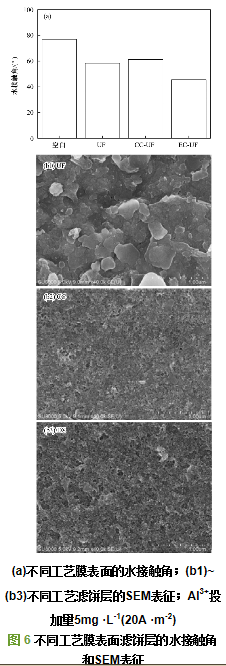 分別對CC-UF工藝與EC-UF工藝中被污染的超濾膜做水接觸角和SEM表征,考察Al3+的投加方式對膜表面濾餅層結(jié)構(gòu)性質(zhì)的影響,結(jié)果如圖 6.由圖 6(a)可知,不同工藝膜表面濾餅層水接觸角的排序為: 90°>空白>CC-UF>UF>EC-UF,說明不同工藝條件下所形成的濾餅層均為親水性,但EC-UF工藝膜表面濾餅層的親水性最強.當(dāng)絮體被吸附到超濾膜表面時,濾餅層就逐漸形成,如果絮體的特性不同,那么濾餅層的密實程度也不同.由圖 6(b)可以看出,僅用UF過濾模擬試驗用水時,膜表面被大量HA覆蓋只能看清零星的幾個膜孔,而且濾餅層非常的密實. CC-UF工藝與EC-UF工藝相比,由于EC產(chǎn)生的絮體強度大且相對緊實,在膜分離過程中不容易被壓力壓碎、壓實,所以EC-UF工藝形成的濾餅層更加的疏松多孔,而且表面也相對比較粗糙.正如Wenzel的研究結(jié)果,物體表面在原有親疏水性的基礎(chǔ)之上,表面的粗糙程度與其親疏水的性質(zhì)呈正比,親水性的物體表面越粗糙其親水性越好,同理疏水性物體表面越粗糙疏水性越好,所以EC-UF工藝膜表面濾餅層的水接觸角較小親水性強.綜上可知,EC-UF工藝條件下形成的濾餅層更加有利于減緩膜污染.。