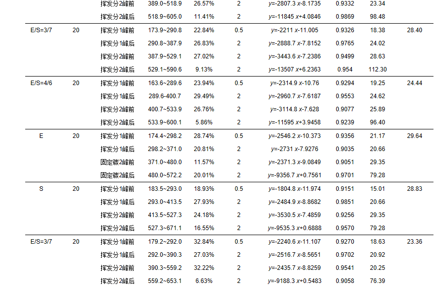 各階段擬合方程的可決系數(shù)在0.9035~0.9986之間, 線性關(guān)系比較好, 說明最終確定的各個(gè)試樣的反應(yīng)級(jí)數(shù)比較合理, 動(dòng)力學(xué)參數(shù)的求解結(jié)果見表 5.由表 5可知, 試樣在燃燒峰前的活化能通常比燃燒峰后的活化能小, 燃燒反應(yīng)峰前通常是反應(yīng)由難變易的過程, 而峰后則是反應(yīng)由易變難的過程.同時(shí)低溫段的活化能也比高溫段的活化能小, 這與固定碳在高溫不易燃燒結(jié)果是一致的.